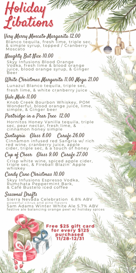 Enjoy our Award-Winning Margaritas, wine, liquor, rotating selection of craft beer and seasonal beverage selections!